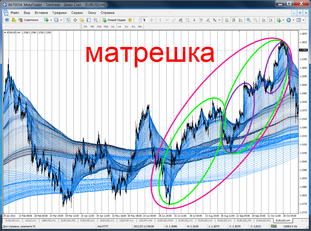8. Любая большая фигура МАТРЕШКА состоит из более мелких матрешек. Если натянутые сетки Фибо входят одна в другую, значит матрешка собрана правильно.И еще если матрешки складываются — будет продолжение тренда, нет — жди разворота тренда.