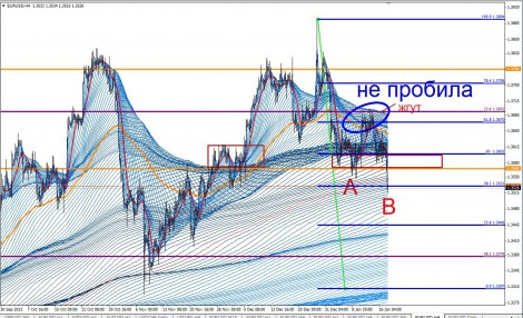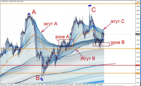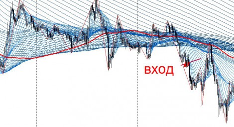 Если цена не пробила жгут сверху, а на откате В перебило А, то цена пойдет на селл