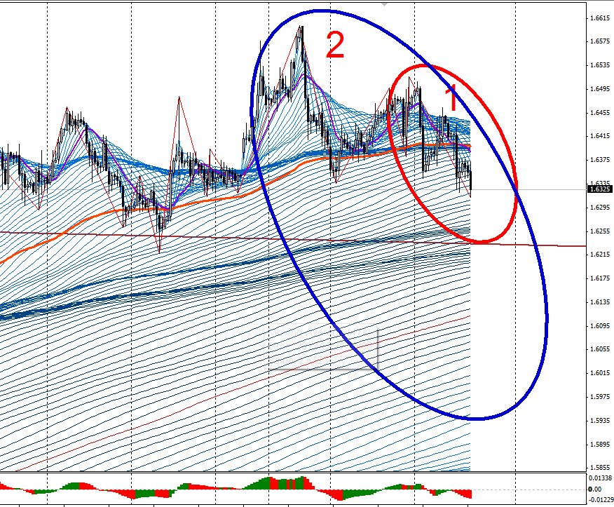 Синий большой эллипс отработан на 75%, так бывает при развороте большого тренда