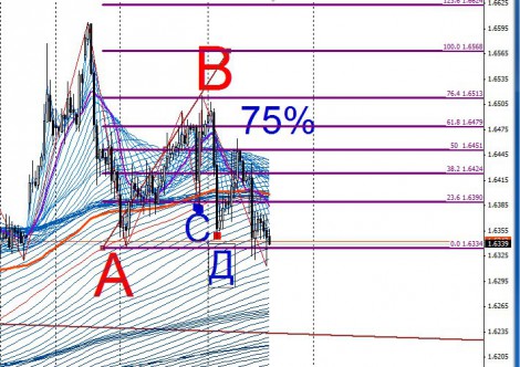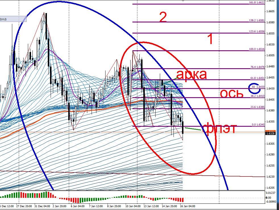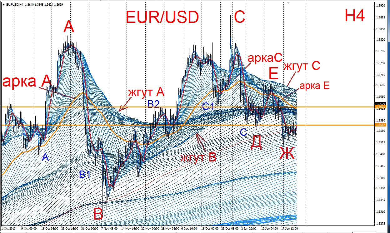 После отработки арки С с плечом СД, последовал откат ДЕ, который не пробил жгут С и далее цена отработала жгут В с малым плечом ЕЖ и осью жгут В
