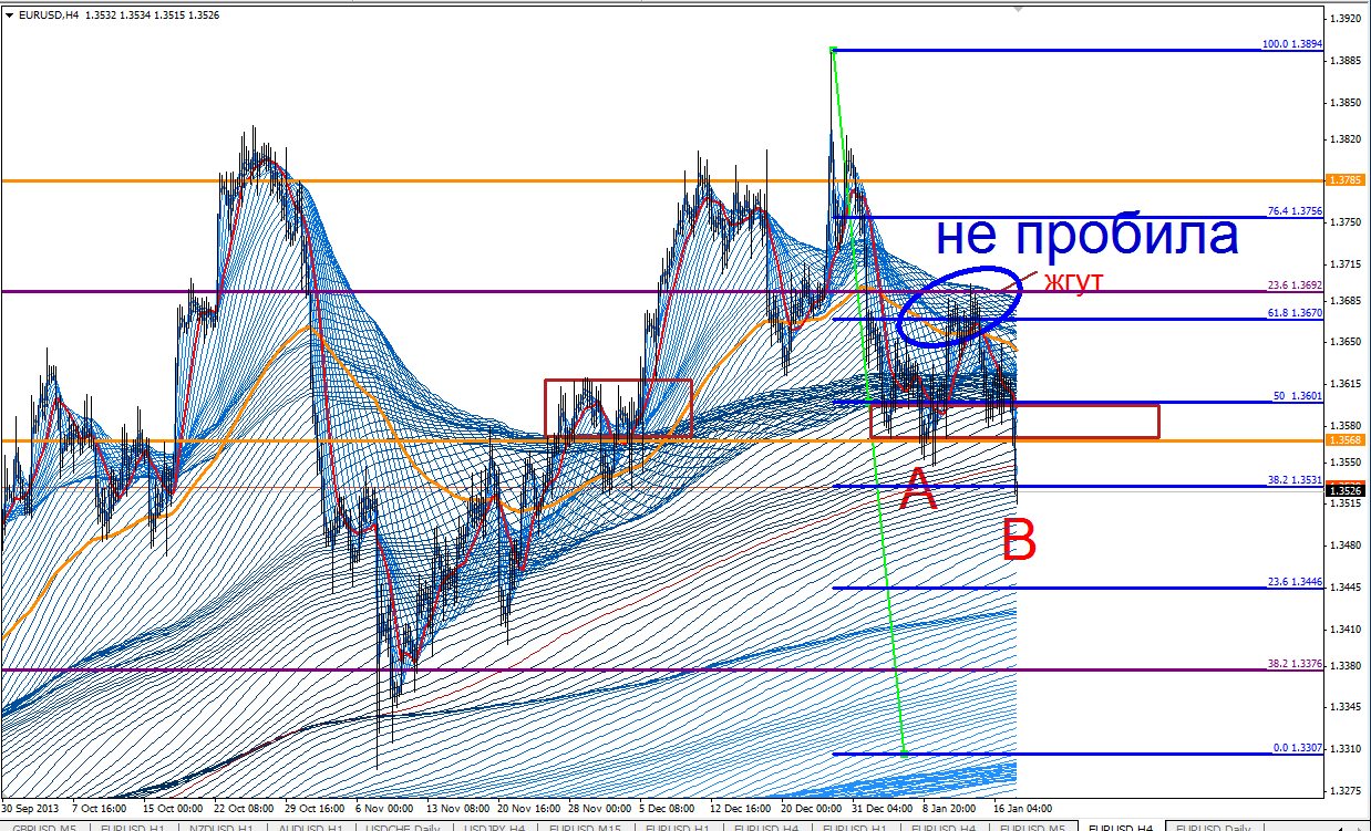 Если движение цены от лоу В образовал жгут В, то после пробития жгута В при движении вниз от С ждем после зоны В свечу с «телом» за пределами зоны В (ТФ- Н4), тогда сможем открыть ордер на селл