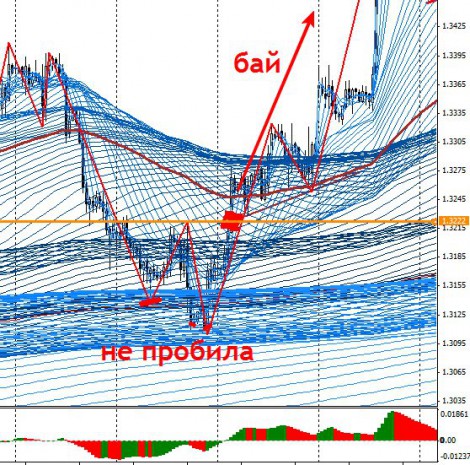 5.Если цена несколько раз пыталась пробить нижний жгут, а на откате превысила хай, то цена уйдет на бай